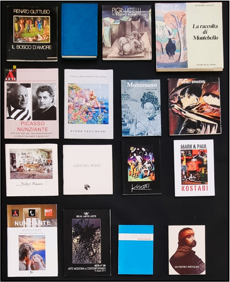 "Blocco" di n. 16 cataloghi così composto: Guttuso (n. 2), Pignatelli, Cesetti, Picasso/Nunziante, Faccincani, Montesano, Brindisi, Piacesi, Del Pezzo, Kostabi (n. 2), Nunziante, Real Arte Aste, Diodati, Pistolesi.