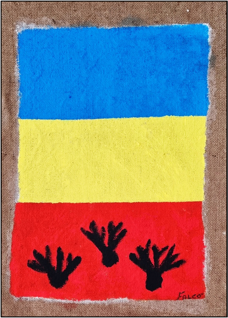 FALCO' PASQUALE Foggia 1952 "Senza titolo" Tecnica mista su tela di juta applicata su faesite, cm 58x80. Opera firmata sul fronte in basso a destra. Autentica su foto a cura dell'artista.