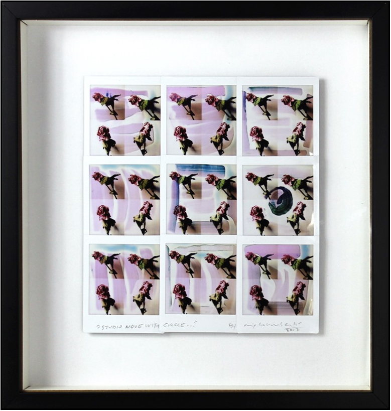GALIMBERTI MAURIZIO Como 1956 "Studionovewithcircle" Fuji instax, mosaico di 9 polaroid cm 20,5x22,5. Firmato sul fronte in basso a destra, intitolato a sinistra. Autentica e numero di archivio dell'artista su foto. Opera pubblicata a pag. 47 del catalogo Flowers 2.