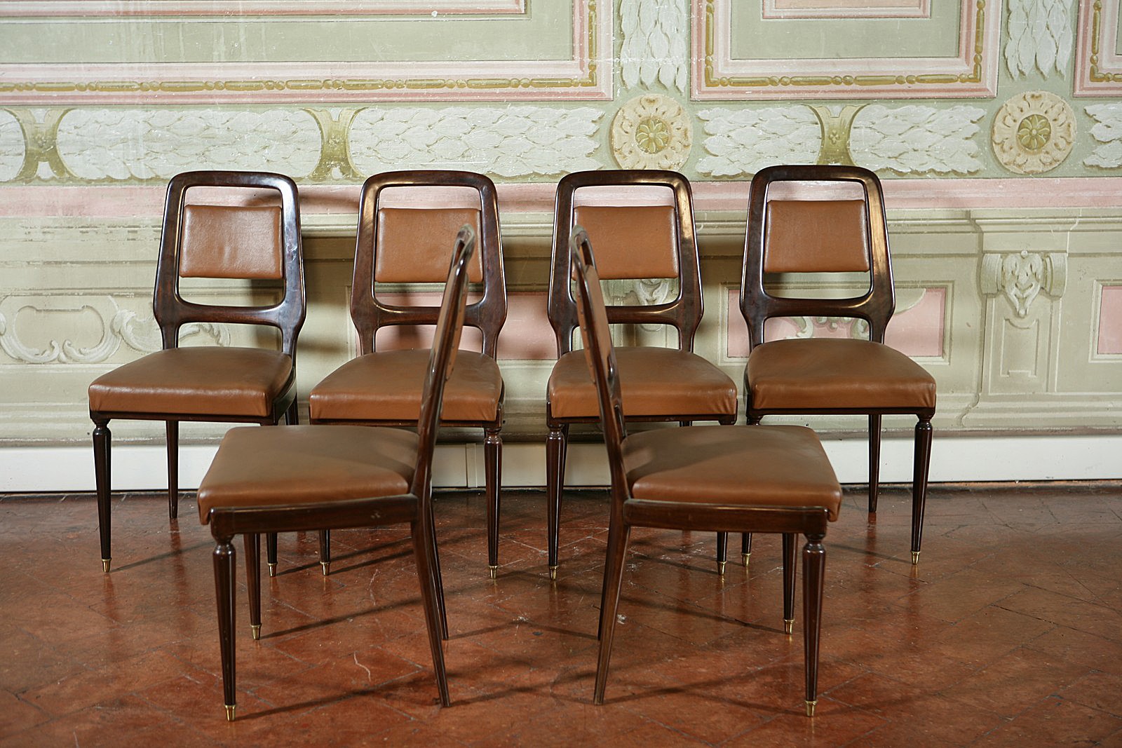 PRODUZIONE ITALIANA - ITALIAN WORK. Sei sedie,produzione lombarda in Mogano e pelle ecologica. Six chairs from Lombardia in Mahogany wood and ecological leather. Legno e pelle. Cm 45x92x45. 1940.