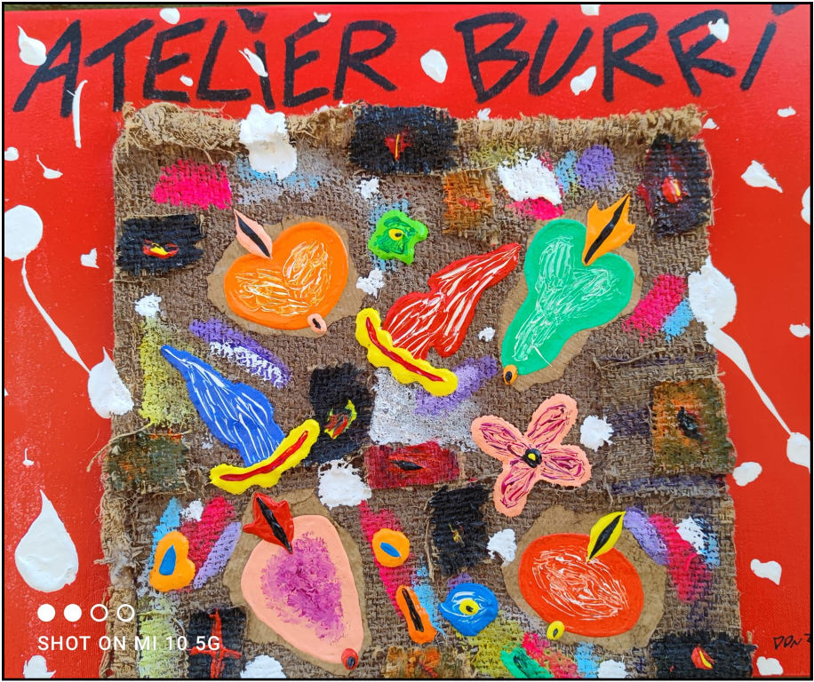 DONZELLI BRUNO Napoli 1941 "Atelier Burri" Acrilico e collage su tela cm 50x40. Opera Firmata sul fronte in basso a destra. Sul retro firma e titolo. Autentica su foto a cura dell'artista.
