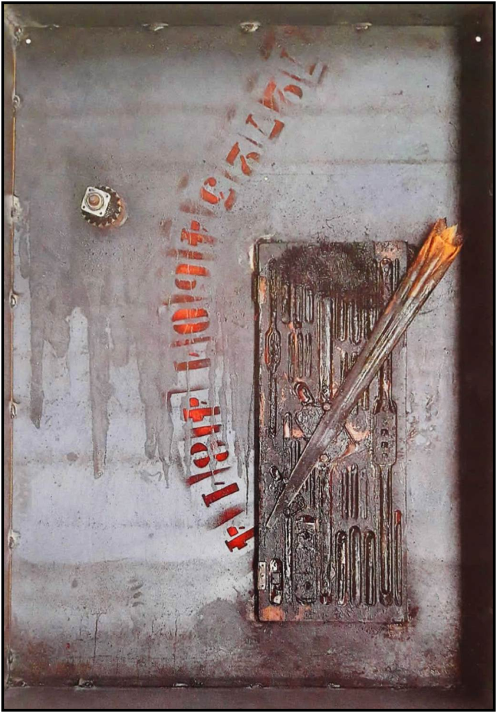 DE CHIRICO JAKOB Innsbruck (AUSTRIA) 1943 "Senza titolo" Acrilici e assemblaggio di oggetti di recupero in teca di acciaio, cm 80x110x33 di spessore. Opera pubblicata a piena pagina del catalogo "Makela".