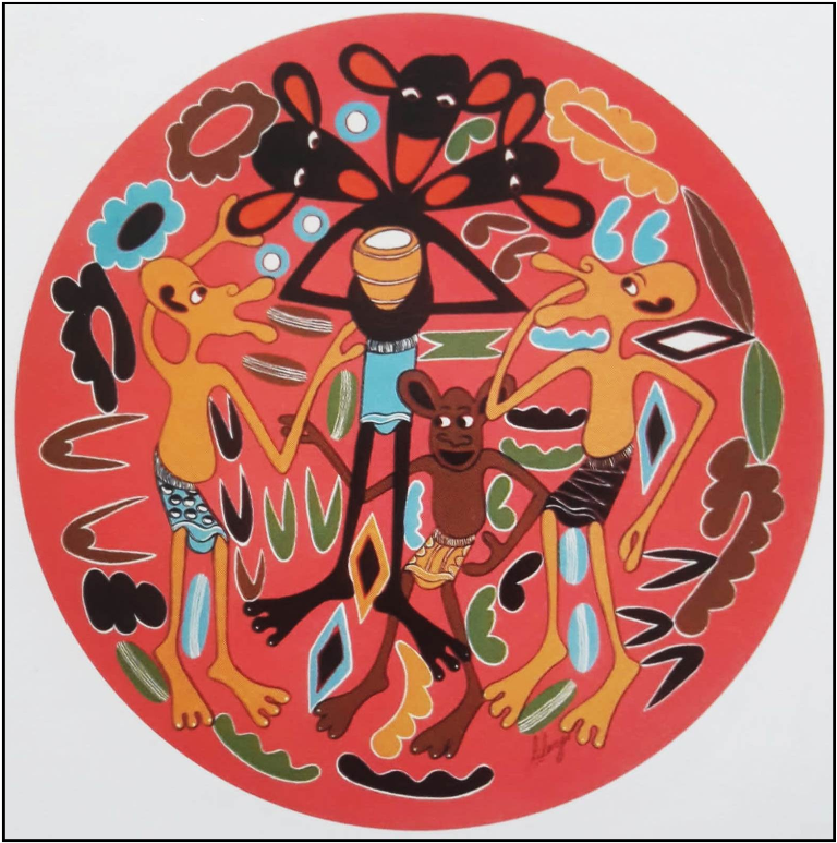 LILANGA GEORGE Kikwetu (TANZANIA) 1934 - Dar es Salaam (TANZANIA) 2005 "Mapacha wenye vivywa" Acrilico su tavola cm 100 di diametro del 1999, provenienza "Sarenco Collection". Opera pubblicata a pag. 166 del catalogo ragionato "George Lilanga" Volume II.