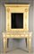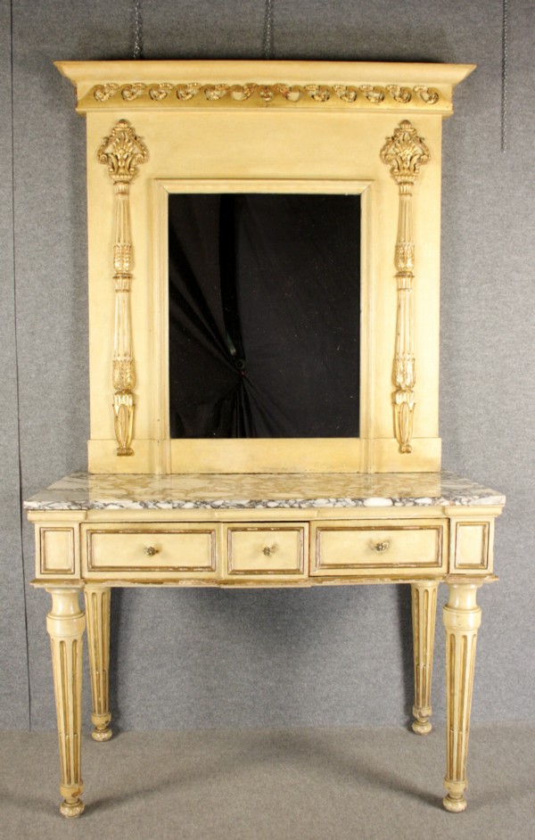 Console con specchiera in legno laccato e dorato, gambe rastremate e piano in marmo. Fine XVIII-inizi XIX secolo. Mis. Lung. cm. 122 Alt. cm. 215 Prof. cm. 62 ca.