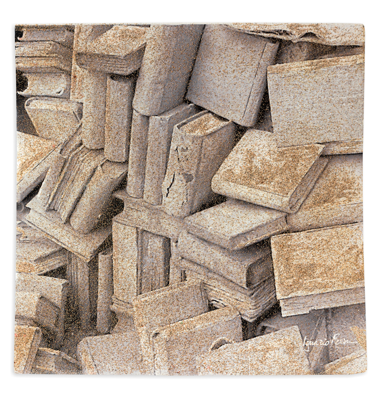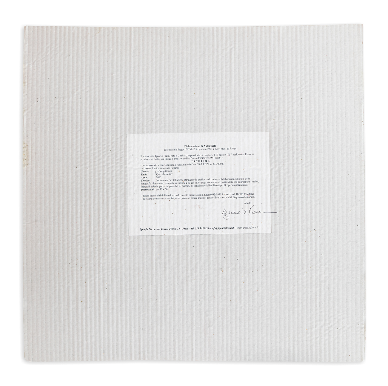 Elaborazione digitale di una fotografia desaturata, raffigurante parte dell'omonima installazione 'Quel che resta', stampata su cartone con ulteriore intervento manuale di resine, minerali, sabbie, polveri, granulati di marmo e aggrappanti