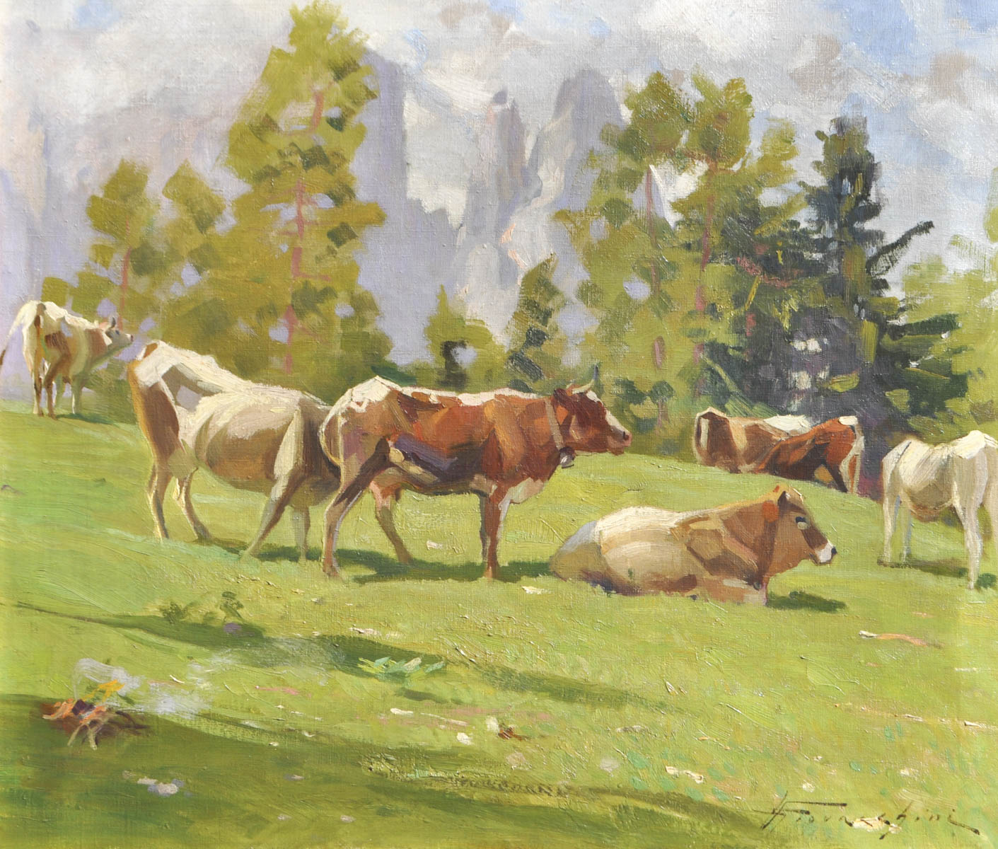 Ulderico Giovacchini (Florenz/Firenze 1890 - Bozen/Bolzano 1965) Mandria di mucche davanti allo Sciliar;Olio su tela, 60 x 69 cm, in cornice