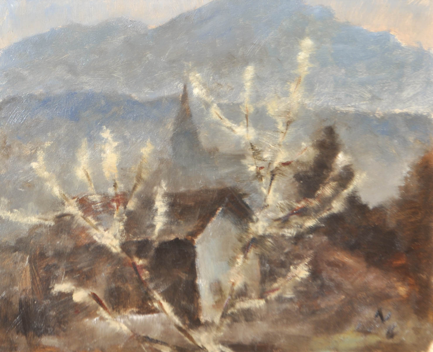 Ernst Nepo Dauba, Böhmen/Boemia 1895 - Innsbruck 1971) Vista dallo studio a Innsbruck verso la Nockspitze,1935 ca.;Olio su cartone, 31,5 x 39,3 cm, in cornice