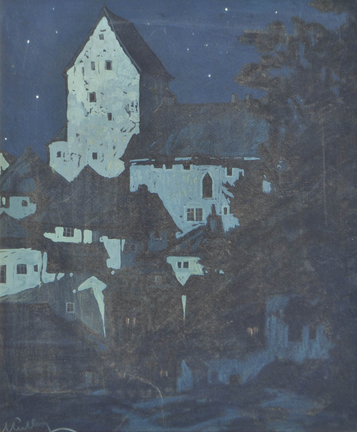 Oskar Mulley (Klagenfurt 1891 - Garmisch-Partenkirchen 1949) Città di notte;Tempera su carta, 29 x 24,5 cm, in cornice