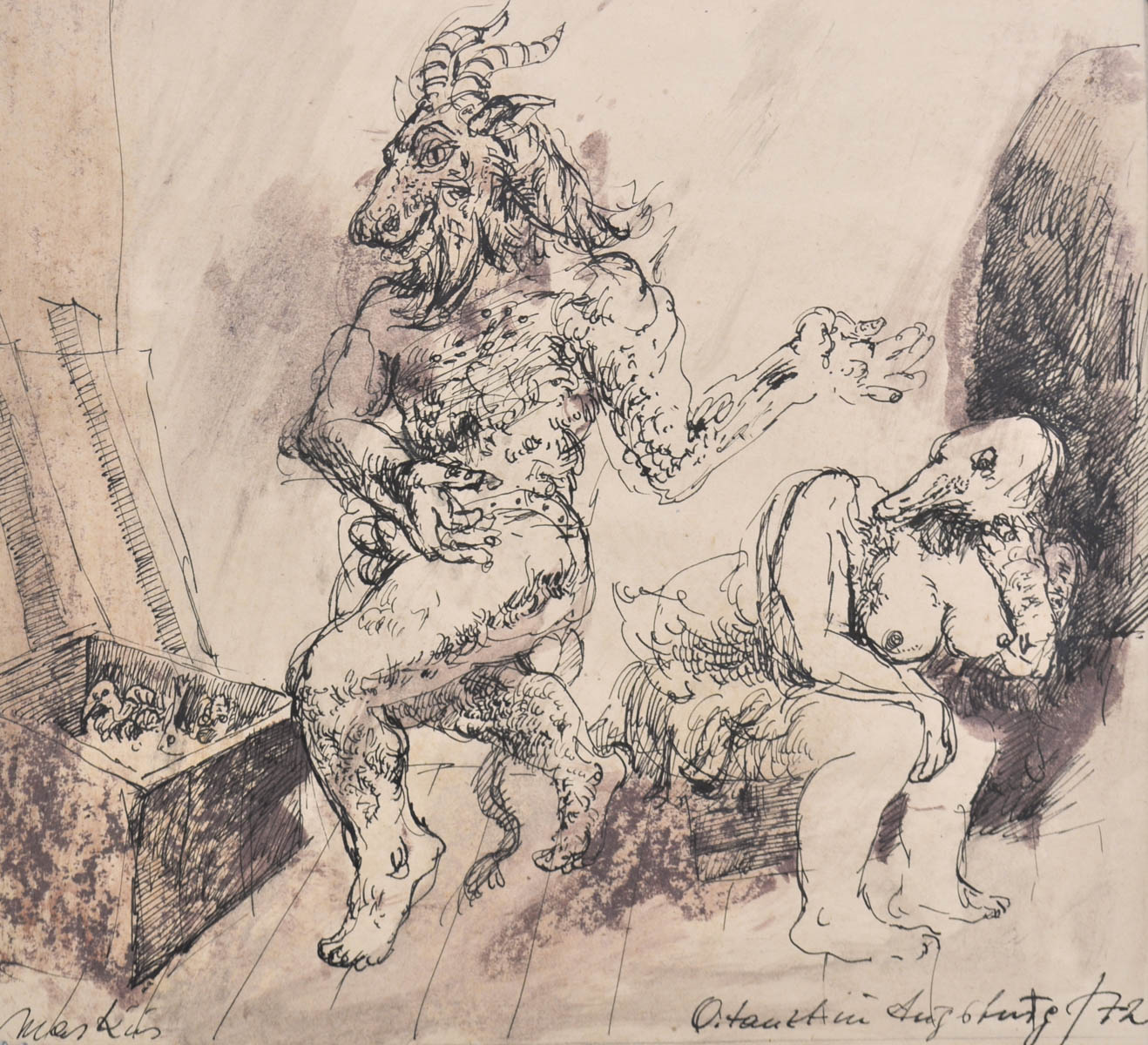 Markus Vallazza (St. Ulrich in Gröden/Ortisei 1936 - Bozen/Bolzano 2019) O. balla ad Augusta, 1972;China acquerellata, 21 x 23 cm (entro il passepartout)