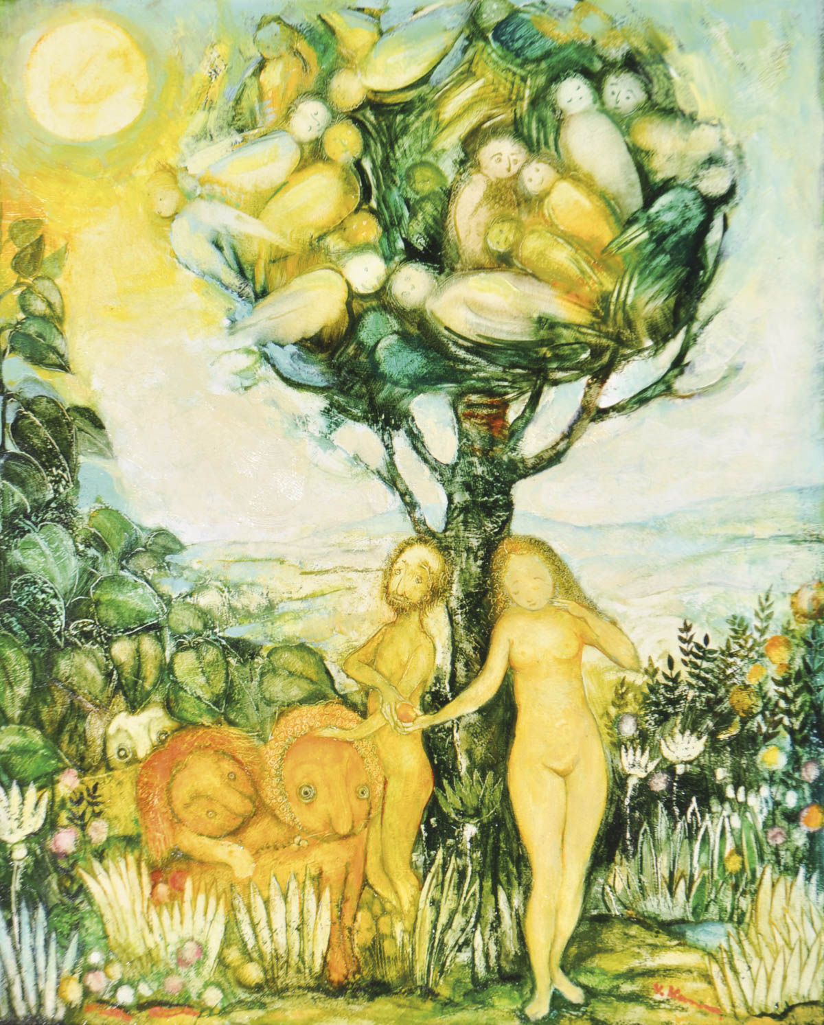 Vladislav Kavan (Baska 1924 -Bozen 2005) Adamo ed Eva con coppia di leoni sotto l’albero della vita, 1979/80;Olio su tavolo, 61 x 49,5 cm, in cornice