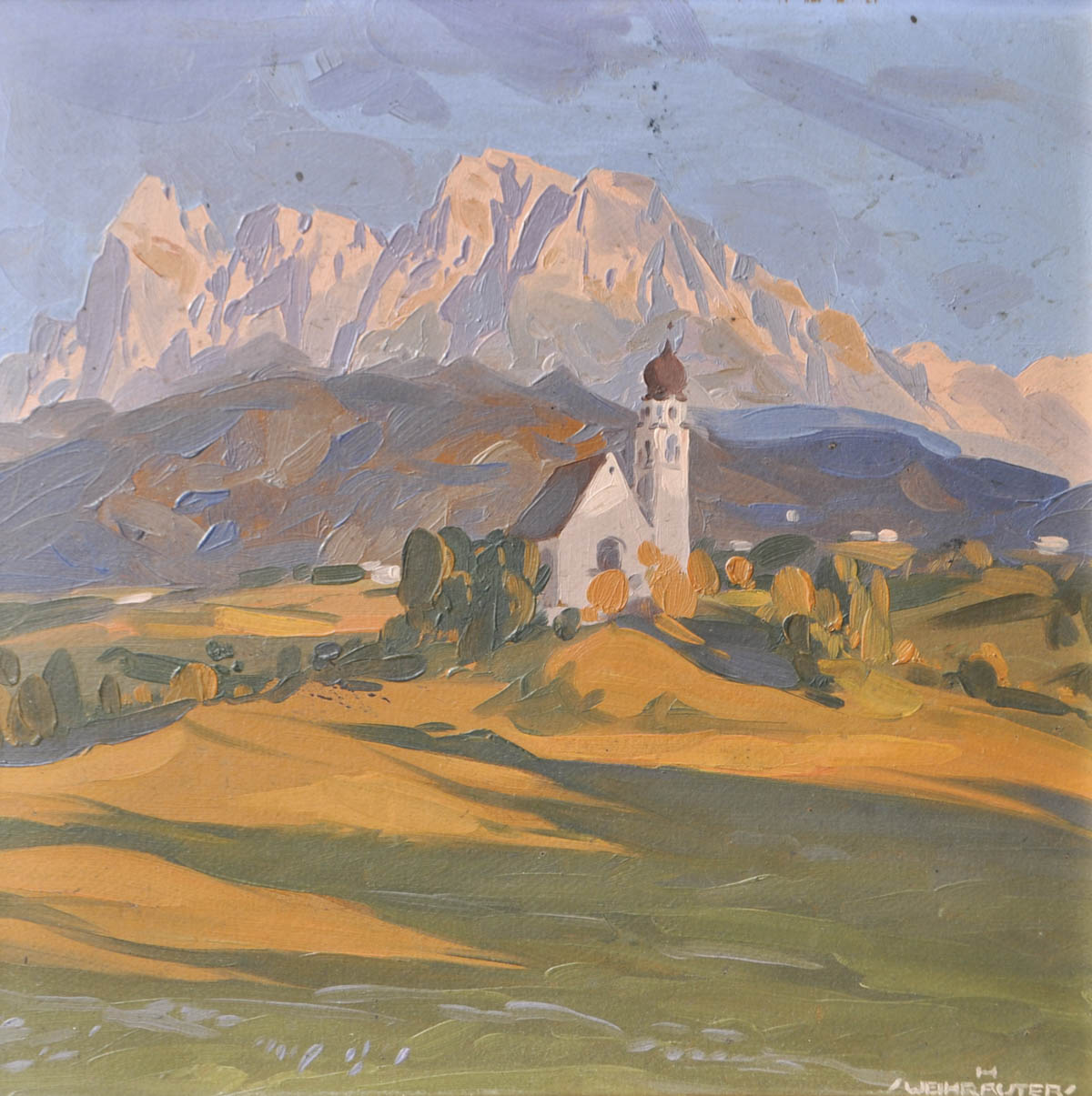 Herbert Weihrauter (München/Monaco 1892 - Brixen/Bressanone 1977) Chiesa di San Costantino davanti allo Sciliar;Olio su cartone, 31,5 x 31,5 cm, in cornice