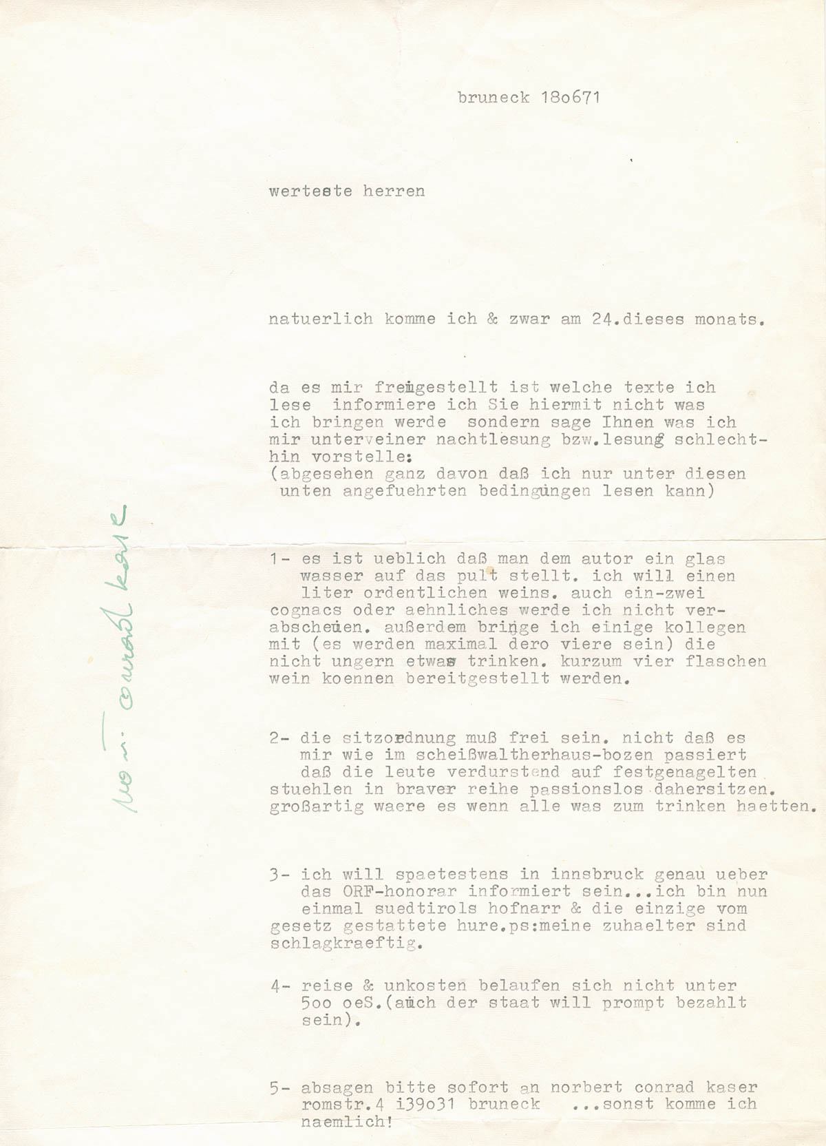 Lotto 506 | Norbert C. Kaser Lettera di Norbert C. Kaser, Brunico, all’ ORF, Innsbruck,...