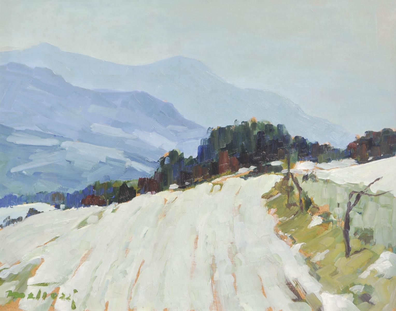 Guido Mattuzzi (Trentino 1902 - 1977) Paesaggio invernale;Olio su tavola, 37,5 x 48 cm, in cornice