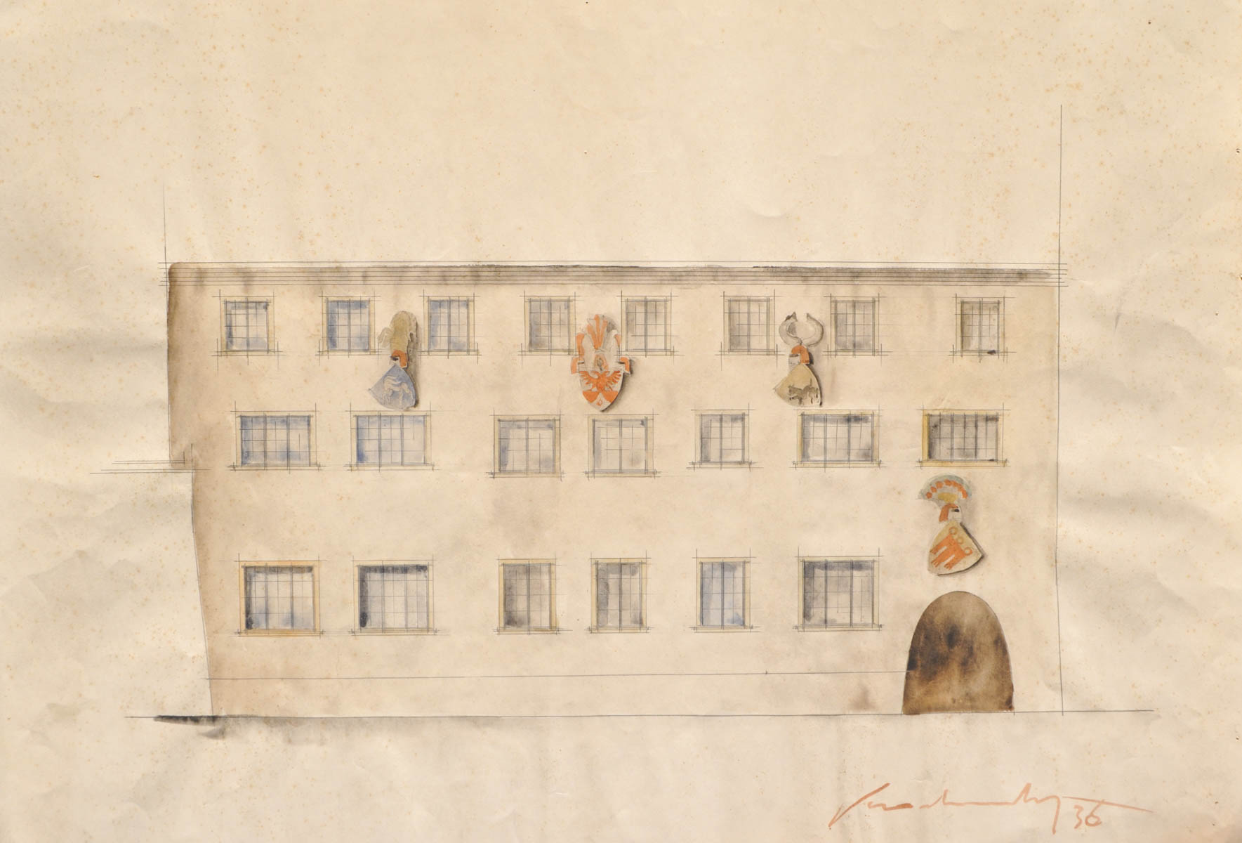 Wilhelm Nicolaus Prachensky Bozzetto per facciata con stemmi degli stati federati dell’Austria, 1937;Acquerello, matita, 44,5 x 64,2 cm, leggere
