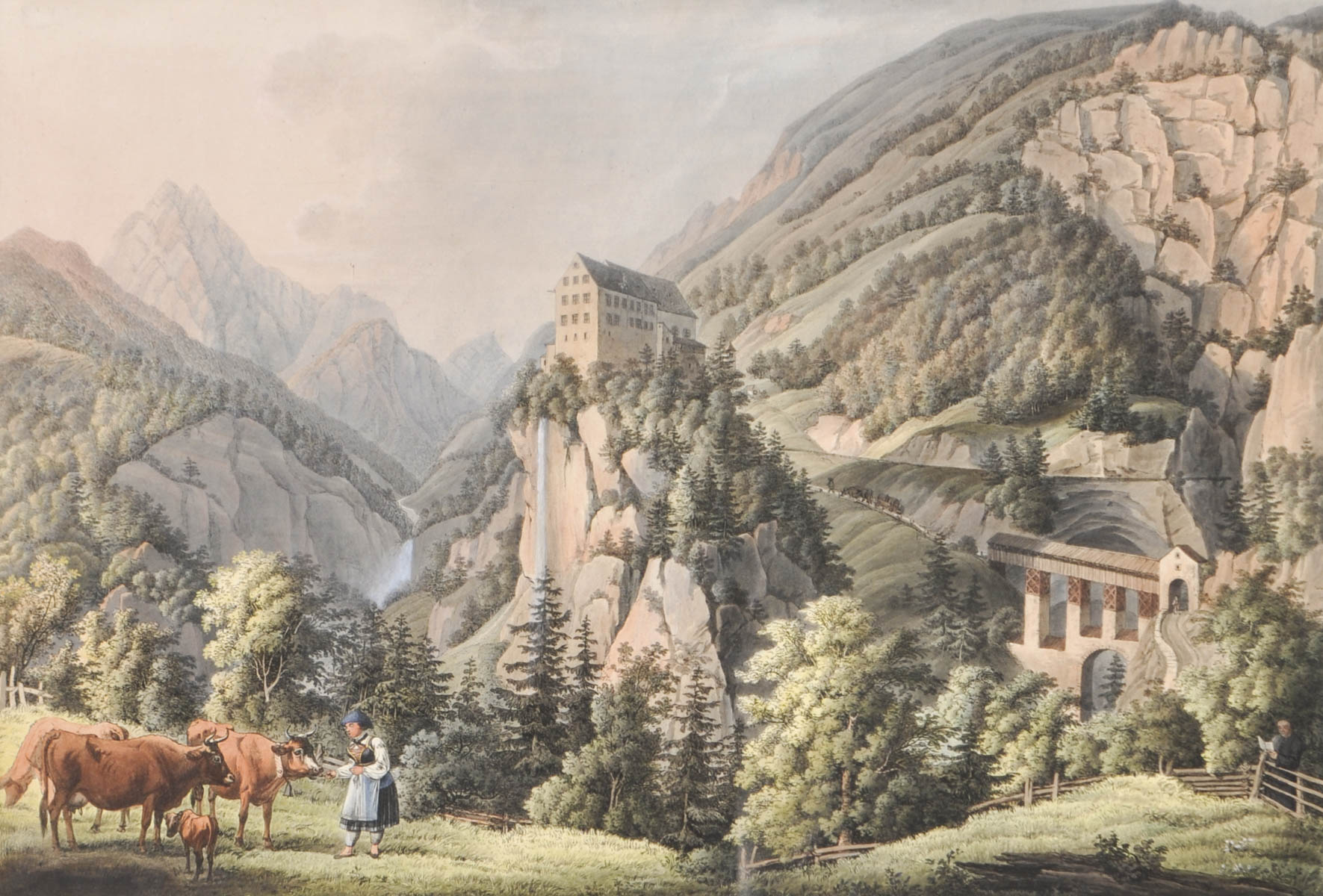 Karl Ludwig Friedrich Viehbeck, J.C, Erhard, J.A. Klein Il monastero Georgenberg presso Schwaz, 1820 ca.;Acquaforte colorata, 36,5 x 53 cm, in cornice