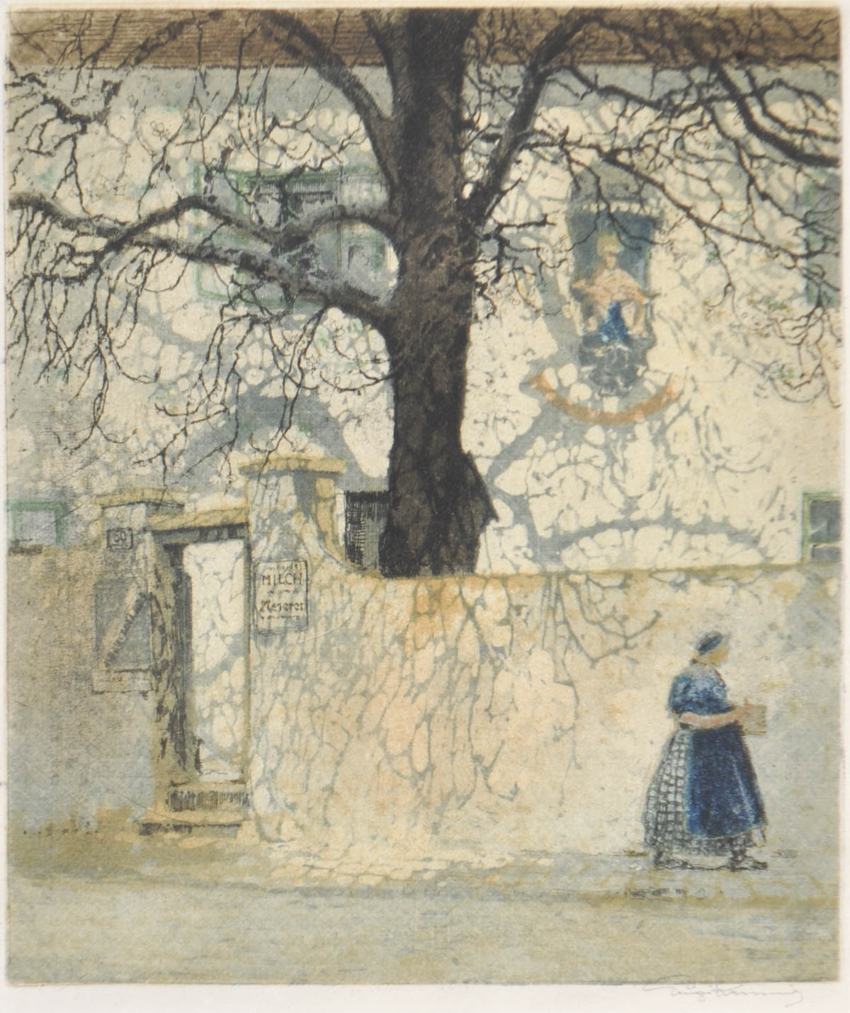 Luigi Kasimir (Pettau/Ptuj, Steiermark/Stiria 1881 - Wien/Vienna 1962) Casa con mescita di latte;Acquaforte a colori, 31 x 25,5 cm (lastra)