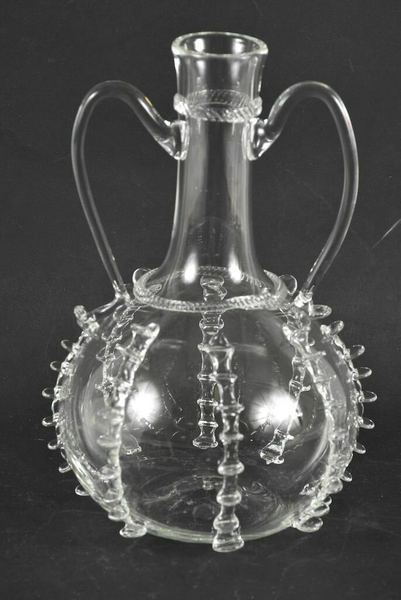 Vetreria Salviati Murano (zugeschrieben/attribuito) Bottiglia, Primi ’900;in vetro trasparente con anse e applicazioni