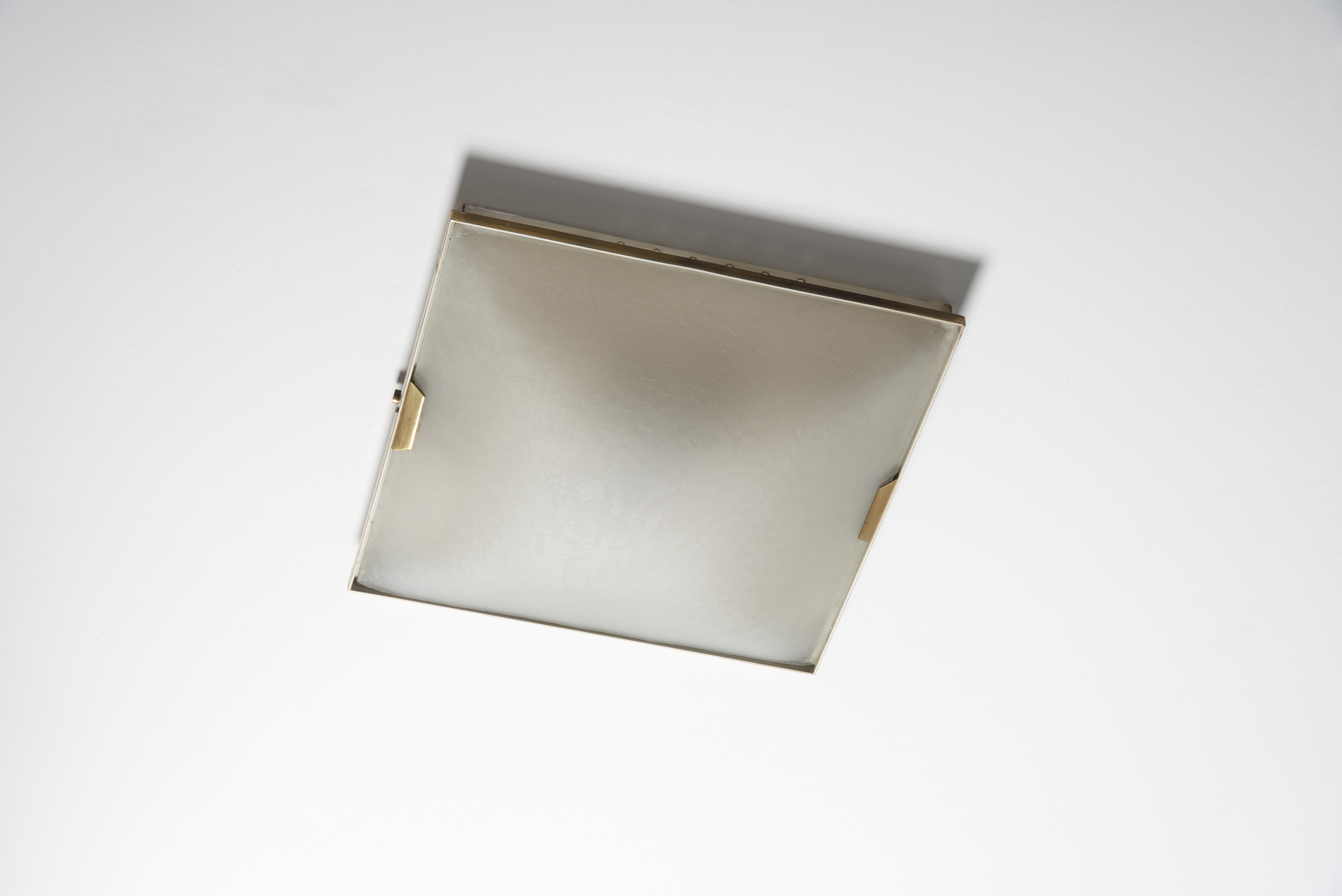 Stilnovo Plafoniera, Anni ’60;In vetro acidato e metallo, 35,5 x 35,5 x 5 cm
