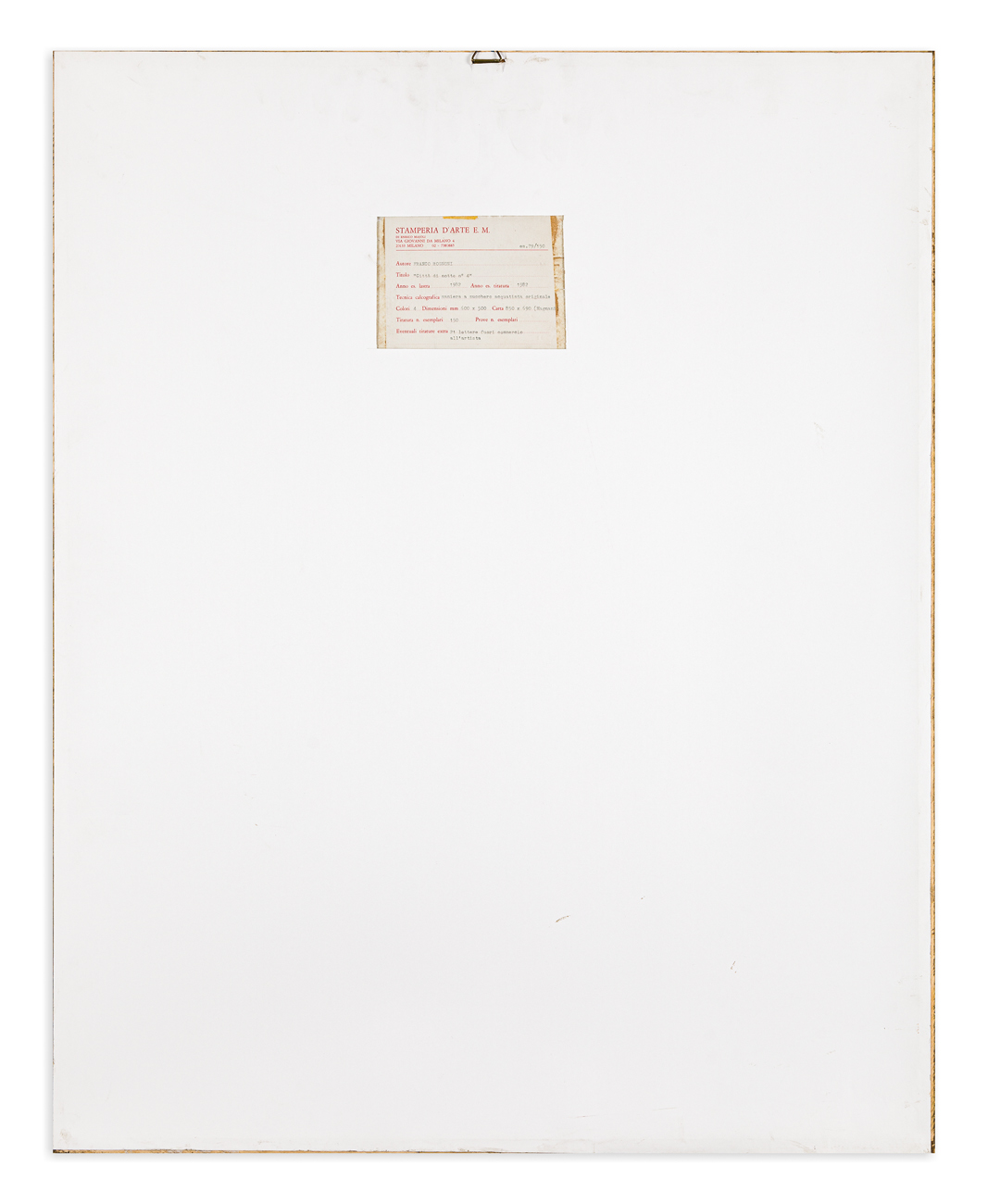 Etichetta della Stamperia d'Arte di Milano con caratteristiche tecniche dell'opera al retro del cartone protettivo