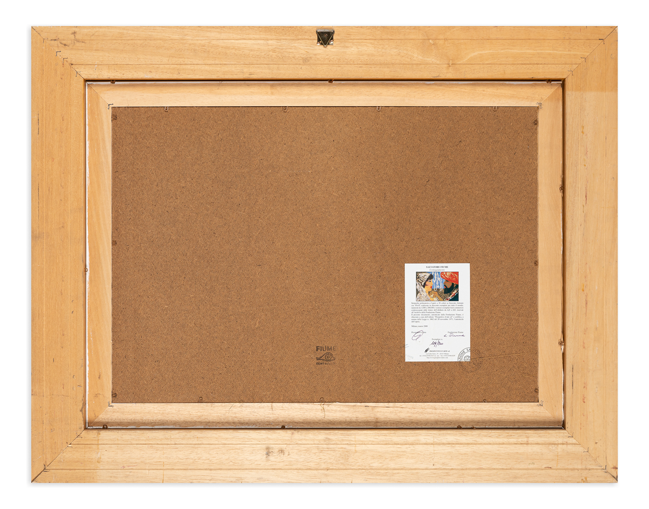 Certificato autenticità dalla Fondazione Fiume e rilasciato dall'Editore Prospettive d'Arte al retro con timbri della Fondazione Fiume e dell'Editore Prospettive d'Arte