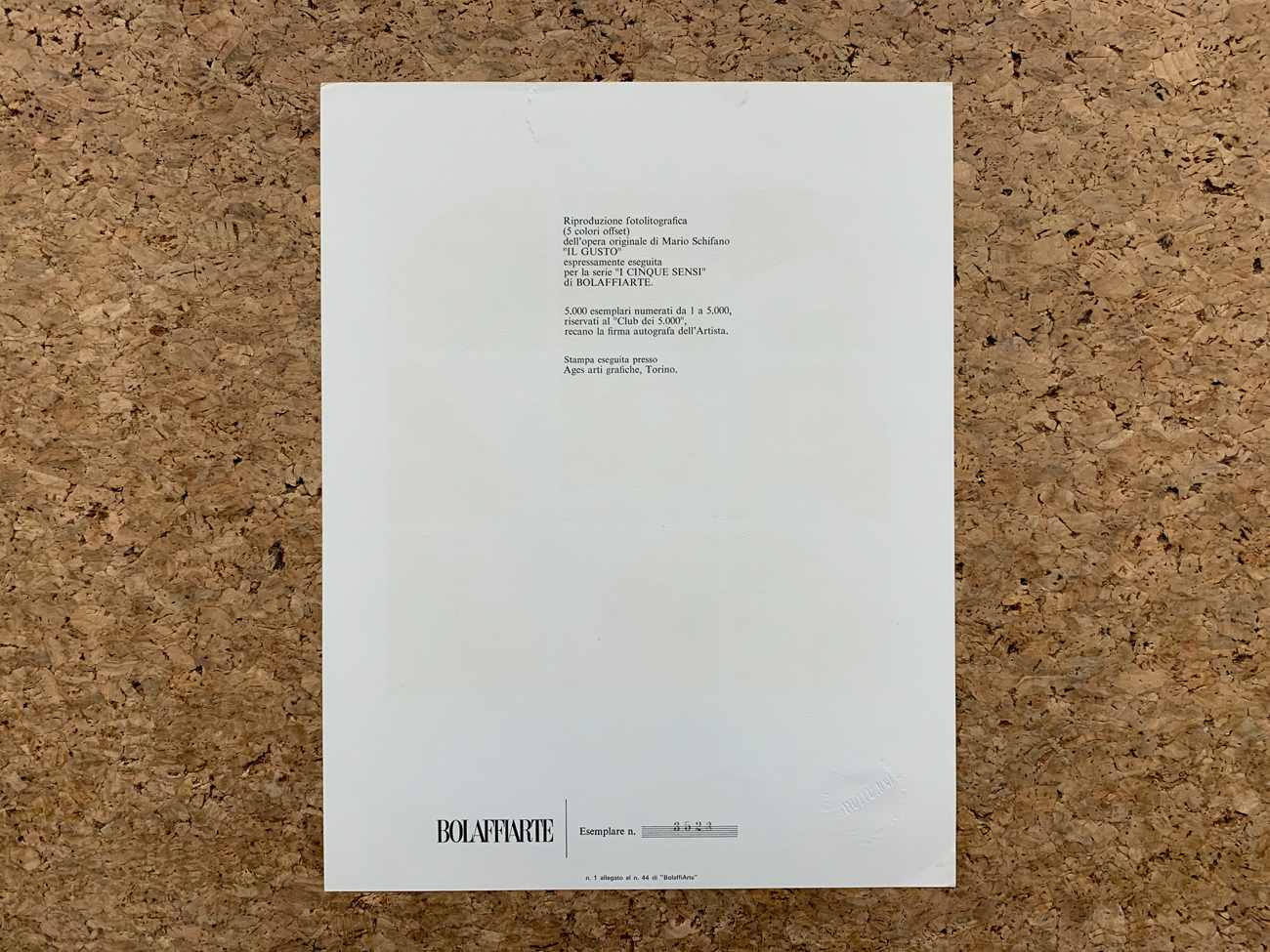 Riproduzione fotolitografia a 5 colori offset dell'opera originale eseguita dall'Artista per la serie 'I cinque sensi' di Bolaffiarte
