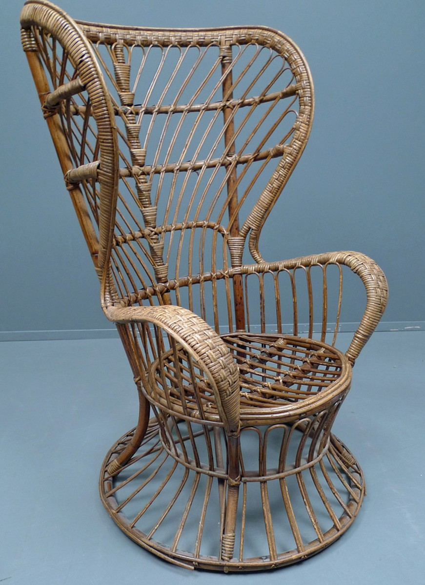 PONTI GIO - CARMINATI LIO. Poltrona in vimini e fermagli metallici. Wicker and metal clasps. Vimini. Cm 80x120x74. Prodotta da Pierantonio Bonacina per l'interno della nave da crociera Conte Biancamano. Difetti. Probably made by Pierantonio Bonacina , designed by Ponti for the interior of the luxury cruise ship "Conte Biancamano '. Usure due to age , defects. Literature: "The decoration Modern", Serie Quarta, R., Aloi, U. Matteotti, Milan 1949, "Gio Ponti, art falls in love of 'industry', Ugo La Pietra, Rizzoli. 1949.