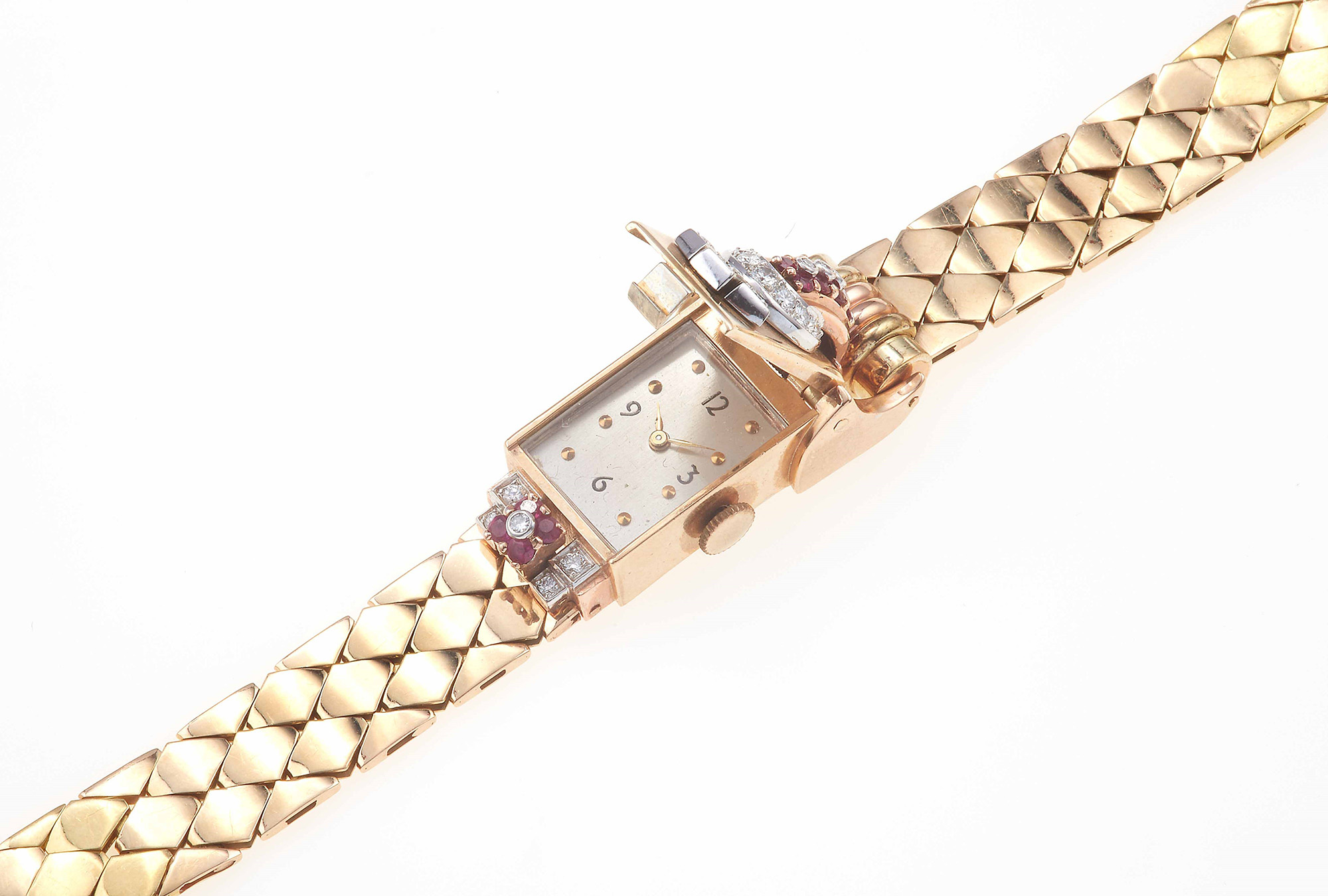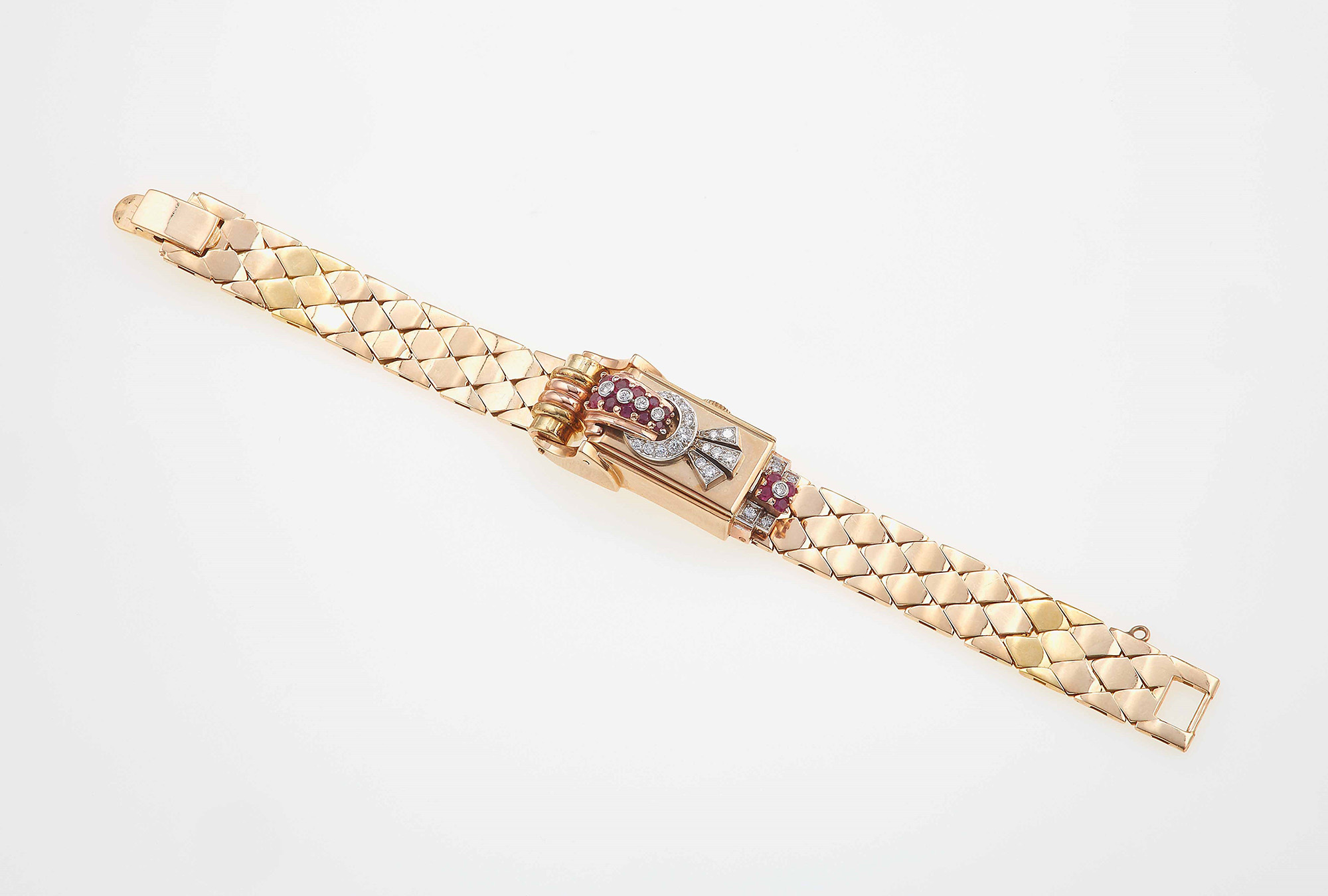 montatura in oro giallo 14Kt decorato con diamanti e rubini, naturali e sintetici, gr 53.9, cm 16.8
