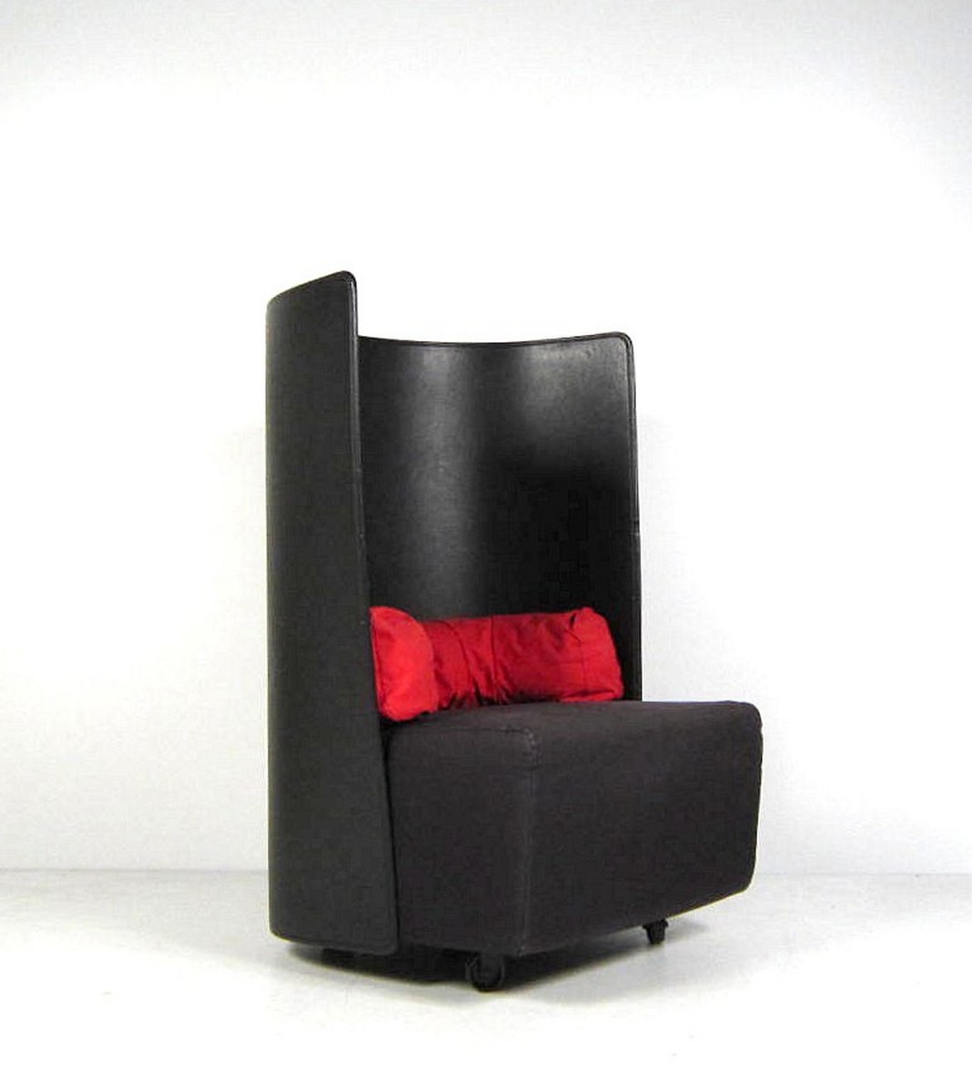 DE PAS-D'URBINO-LOMAZZI. Poltrona. Armchair. Legno e cuoio. Cm 72x110x65. Poltrona modello Campo per Zanotta. Struturaa in legno, ricoperto di cuoio, e seduta in tessuto originale, con il suo cuscino. Armchair for Zanotta. Woodden structure covered with black leather, seat in original fabric, with it's own cushions. 1984.