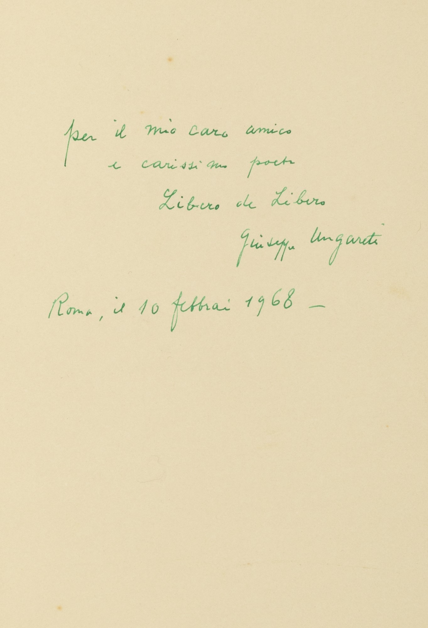 Sulla prima pagina del volume la dedica di Giuseppe Ungaretti: per il mio caro amico e carissimo poeta Libero de Libero, Roma il 10 febbraio 1968