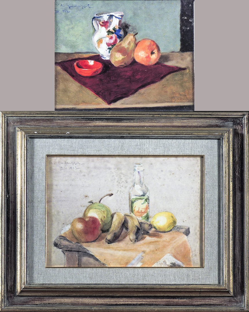 NATURE MORTE due dipinti ad olio su cartone e acquerello su carta, firmati e datati 955 e 956, in cornice cm 26x33 e cm 29x39