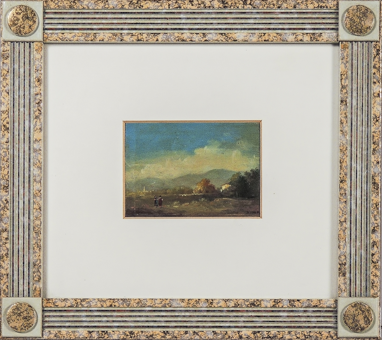 RENATO ZINI (1890-1969) Paesaggio campestre con personaggi olio su tavoletta,firmato, in cornice cm 7x10