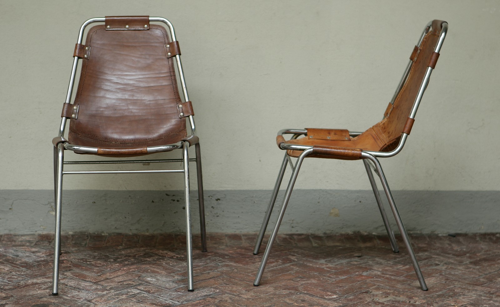 PIERRAND CHARLOTTE. Due sedie disegnate per l'arredamento del "Resort les Arcs 1800". Two chairs designed for the furnishing of "Resort les arcs 1800". Alluminio e pelle. Cm 48x83x48. Struttura in alluminio, seduta in pelle marrone. Difetti. Aluminium frame, seat in brown leather. Defects. 1960. Difetti. Defects.
