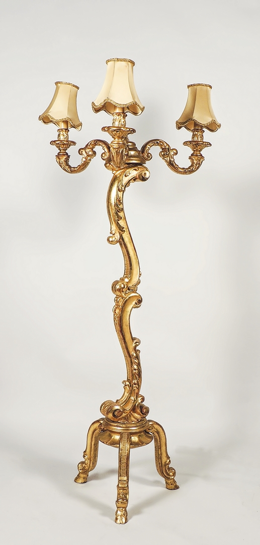 PIANTANA IN LEGNO INTAGLIATO E DORATO XIX secolo tre bracci a tralcio di foglie d'acanto, fusto a volute contrapposte, tre gambe mosse h cm 126
