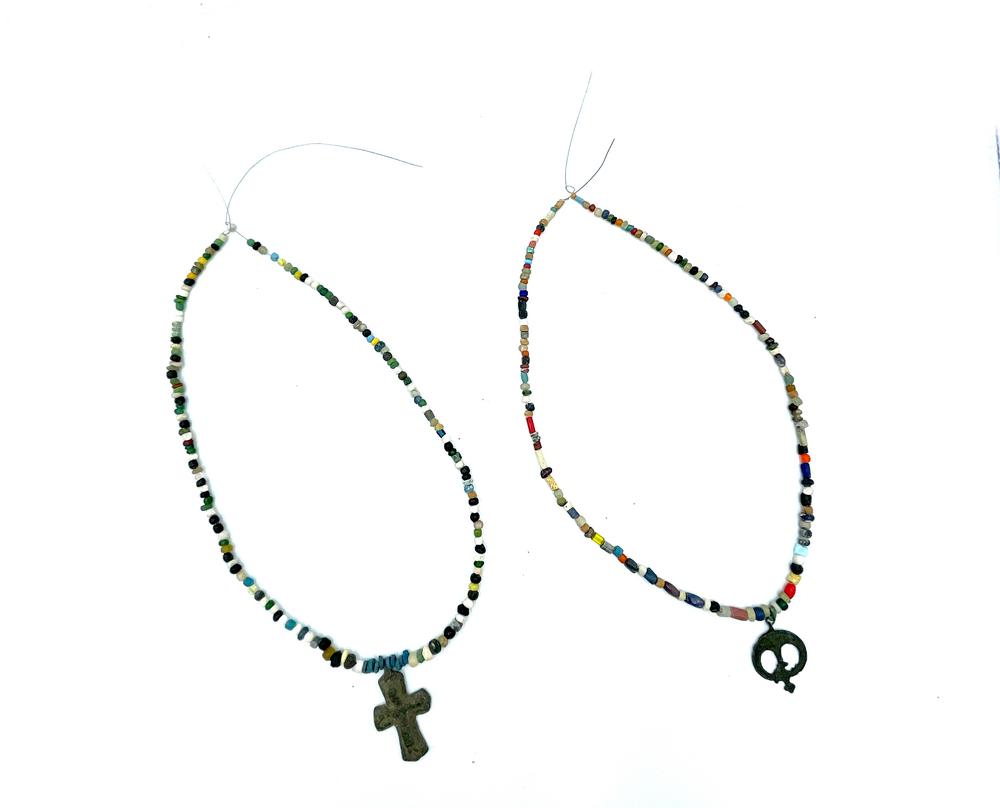 Due collane ad un filo con vaghi in pasta vitrea colorata una con pendente a croce greca con crocifisso e l'altra con crescente lunare in bronzo fuso (2)