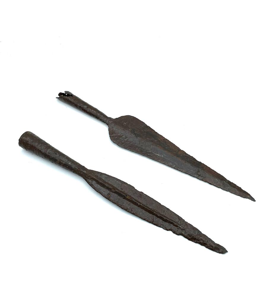 Due grandi punte di lancia con immanicatura a cannone, lama foliata e costolata (2)