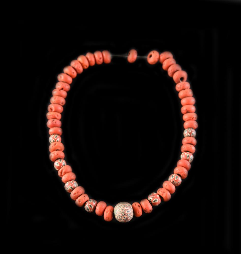 Una collana a ad un filo a grandi vaghi globulari schiacciati e nove vaghi in vetro millefiori