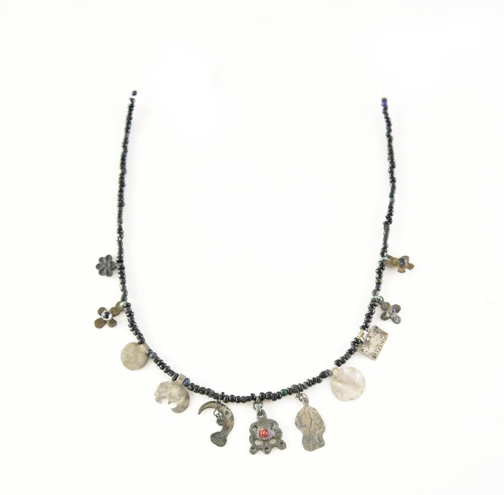 Collana ad un filo con vaghi in pasta vitrea nera con undici pendenti in argento e bronzo fuso, traforato e cesellato