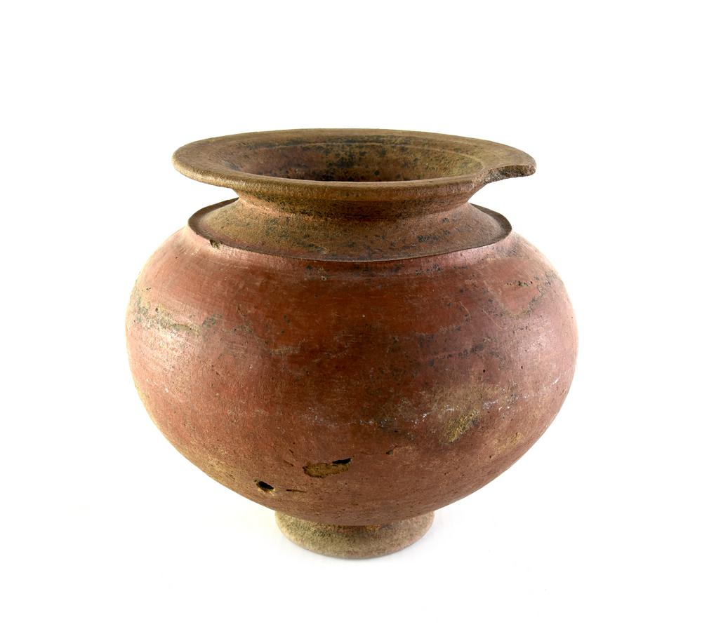 Olla con orlo estroflesso decorato da solcature parallele, collo cilindrico distinto dalla spalla mediante un collarino in rilievo, corpo globulare, piede a tromba