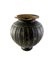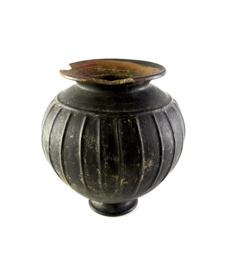 Olla con ampio orlo svasato, decorato a solcature, collo cilindrico distinto, spalla obliqua, corpo globulare, piede a tromba; decorata sul ventre a partire da un collarino a rilievo sulla spalla da costolature verticali in rilievo