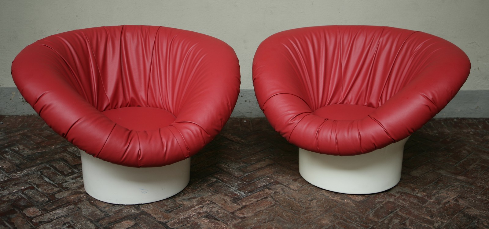 PAULIN PIERRE nello stile di. Due poltrone a pozzetto imbottite, rivestite in Skai rosso. Two armchairs, upholstered in red ecological leather. Cm 89x60x85. 1975.