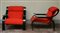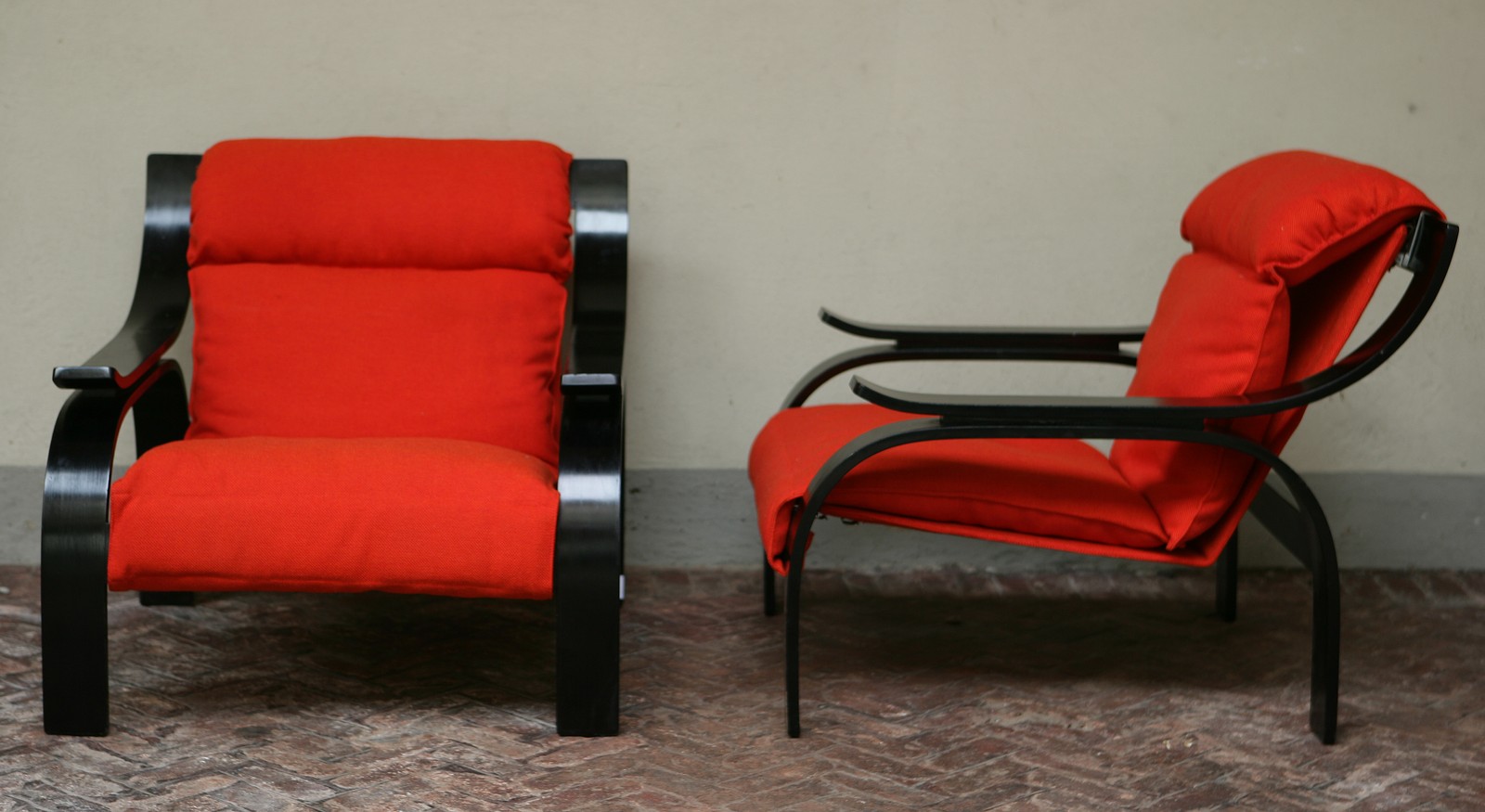 ZANUSO MARCO. Due poltrone "Woodline" per Artflex.Struttura a vista in compensato curvato laccato con lamine metalliche elastiche interne,seduta e schienale imbottiti in poliuretano,rivestiti di stoffa rossa. Two armchairs "Woodline" for Artflex.Bended frame in lacquered plywood, seat and back upholstered in polyurethane, covered with red fabric. Compensato, metallo e stoffa. Cm 69x74,5x76. Bibliografia: G. Gramigna "Design italiano 1950-2000", Allemandi vol. I pag. 106