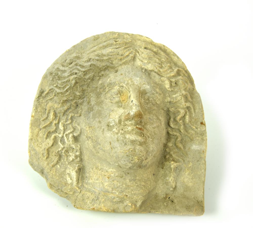 Antefissa ad arco con busto femminile volto a sinistra con folti capelli ondulati che ricadono sul collo; la giovane indossa degli orecchini troncoconici rovesci e porta una collana; il volto è accuratamente delineato con grandi occhi con indicazioni di sopracciglia, palpebre e pupilla