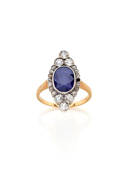 Anello a marquise in oro e platino con zaffiro ovale di ct. 2,30 circa e diamanti old mine, g 3,34 circa misura 10/50. (mancanze)