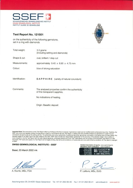 Appended gemmological report SSEF n. 121501 22/03/2022, Basilea