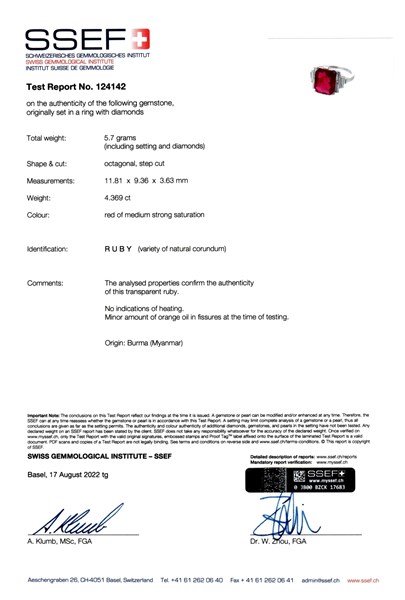 Appended gemmological report SSEF n. 124142 17/08/2022, Basilea