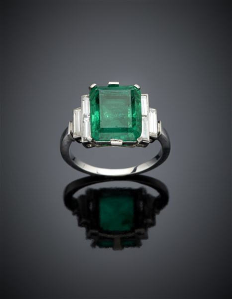 Anello in platino con smeraldo ottagonale di ct. 4,377 e diamanti a baguette, g 5,69 circa misura 12/52. Firmato Cartier London.