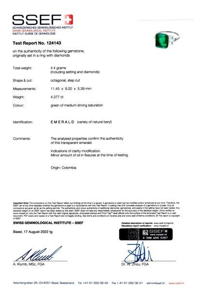 Appended gemmological report SSEF n. 124143 17/08/2022, Basilea