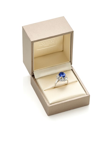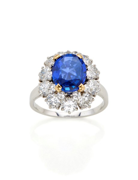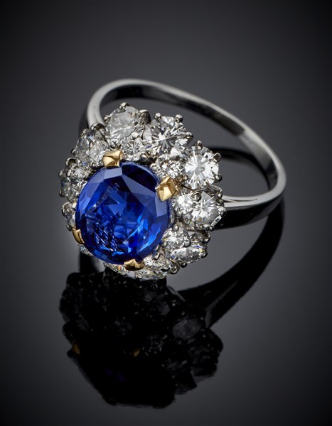 Lotto 530 | BULGARI Anello in platino con zaffiro ovale di ct. 3,34 circa contornato da dia