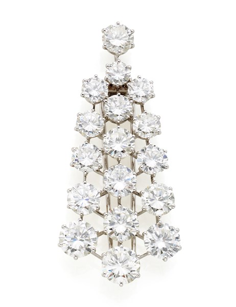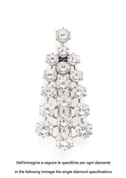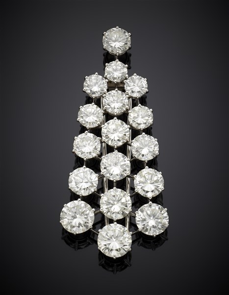 Broche/pendente in oro bianco e diamanti a scalare da ct. 0,85 a ct. 2,30 circa, per complessivi ct. 25,50 circa, g 16,53 circa, lungh. cm 6,20 circa. Firmata Villa.