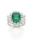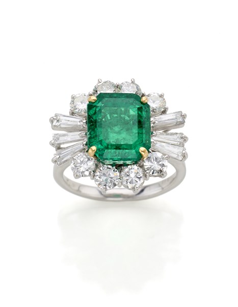 Anello in oro bianco con diamanti rotondi e tapered per complessivi ct. 1,70 circa a contornare uno smeraldo ottagonale di ct. 5,09, g 6,24 circa misura 12/52.
